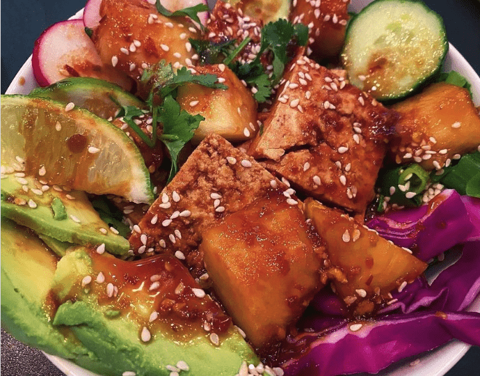8. Spoon the tofu evenly into both bowls leaving some of the marinade behind. Drizzle the entire bowl with the rest of the marinade once everything is assembled. Option to garnish with sesame seeds.